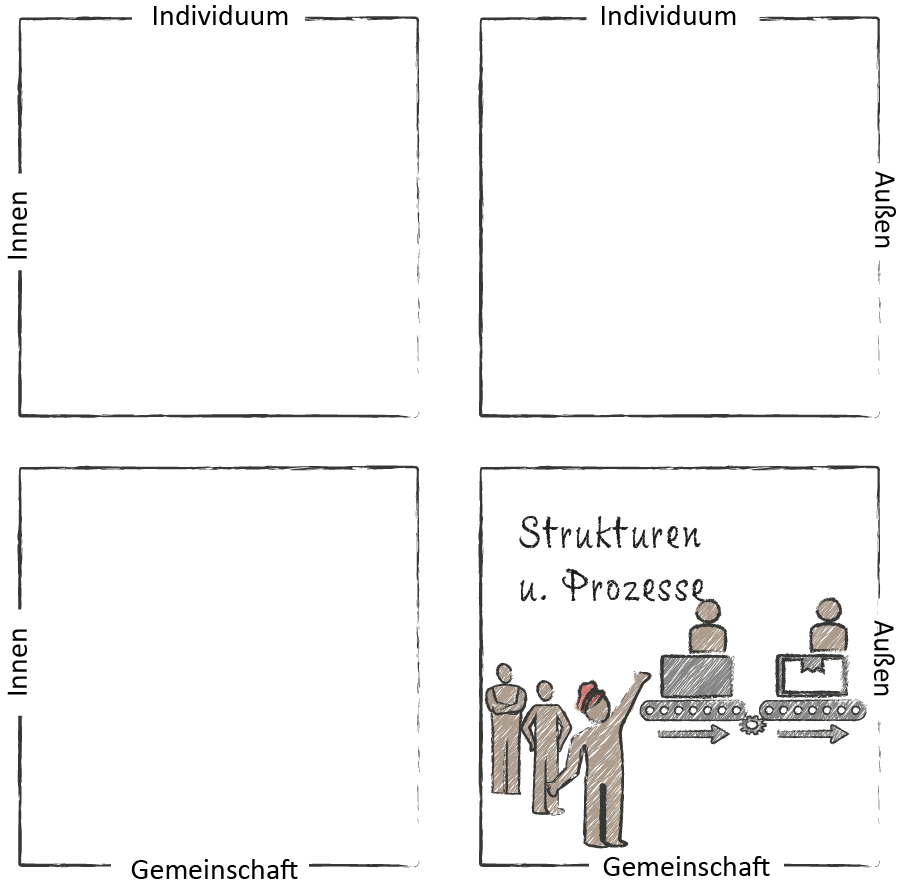 Qualität gelingt vor allem dann, wenn persönliche Werte in hohem Maße im Einklang sind mit der gelebten Kultur und den strukturellen und personalen Rahmenbedingungen einer Organisation. Klare Regeln und Strukturen geben uns Sicherheit. Je komplexer und dynamischer Aufgabenbereiche sind, desto weniger können wir aber im Vorfeld planen und regeln und desto wichtiger ist es, Sicherheit und Halt nicht nur im Außen zu suchen, sondern auch in uns selbst bzw. im Team zu finden. Joana Breidenbach und Bettina Rollow haben sich in ihrem sehr lesenswerten Buch „New Work needs Inner Work“ intensiv mit dem AQAL-Modell von Ken Wilber beschäftigt. Übertragen auf das Qualitätsm