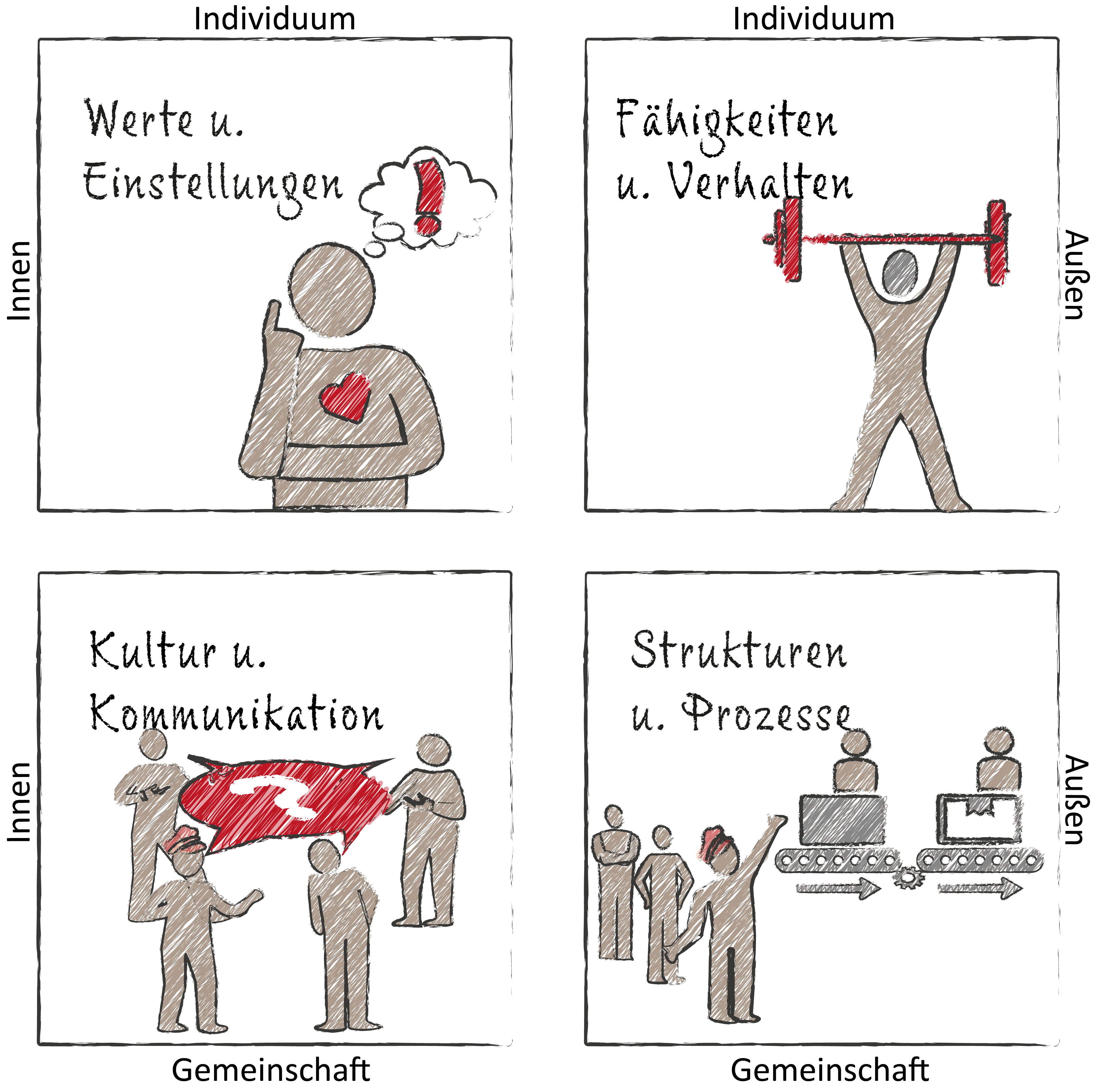 Strukturen und Prozesse sind ohne Zweifel wichtig, aber eben nicht alles. Die Reflexion einer guten Balance zwischen den Quadranten kann jedem QM-System zu mehr nachhaltigem Erfolg verhelfen. Ob ganz grundsätzlich auf der Metaebene oder ganz konkret auf der Prozessebene: Sie möchten den Umgang mit Fehlern in der Organisation verändern? Dann hilft es sicherlich ein gemeinsames Vorgehen zu vereinbaren. Aber erst dann, wenn Mitarbeiter auch über die entsprechenden Kompetenzen verfügen und das Vorgehen im Wesentlichen mit ihren persönlichen Werten übereinstimmt und der Kultur der Organisation entspricht, kann sich das vereinbarte Vorgehen wirklich entfalten.